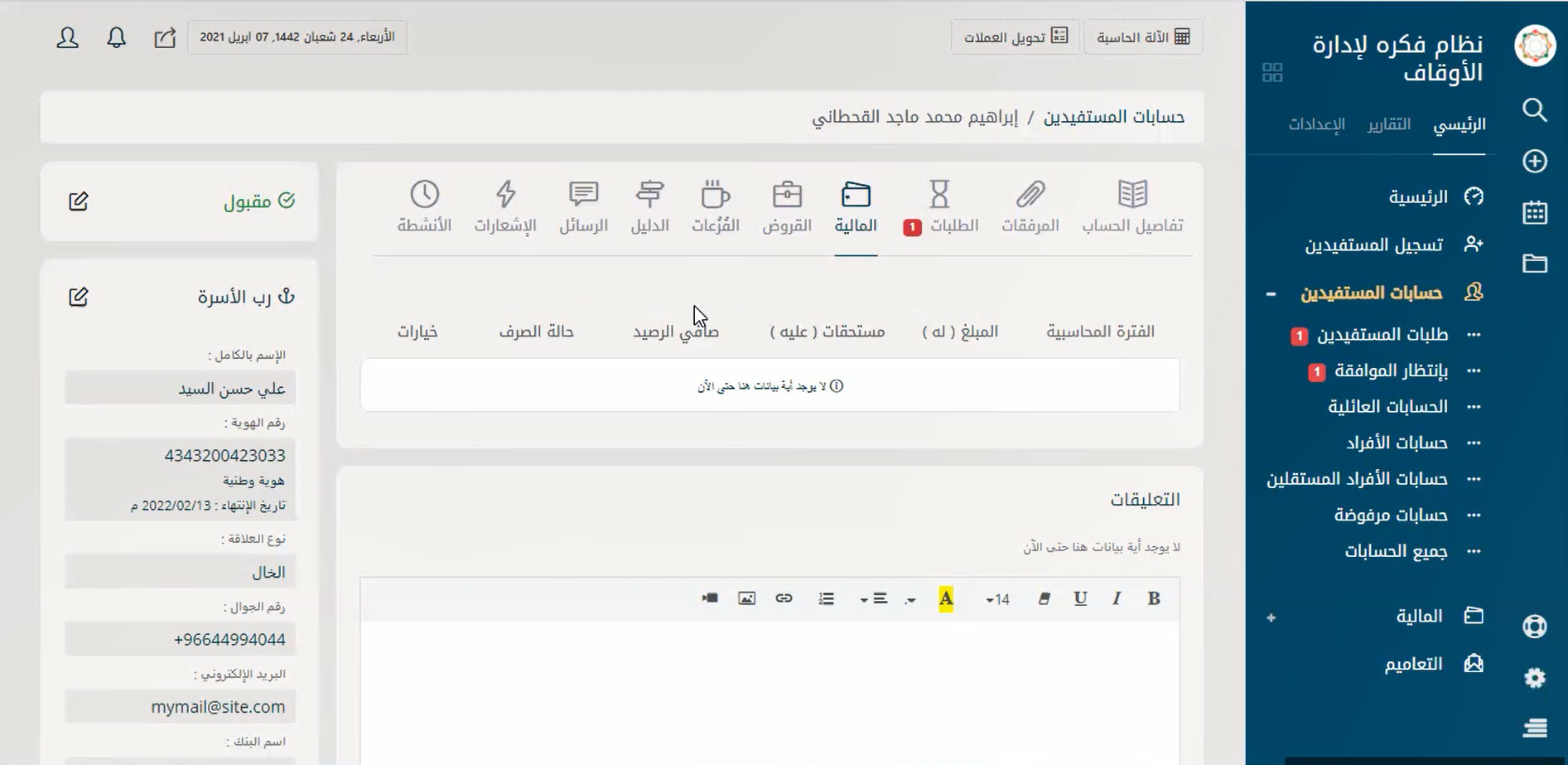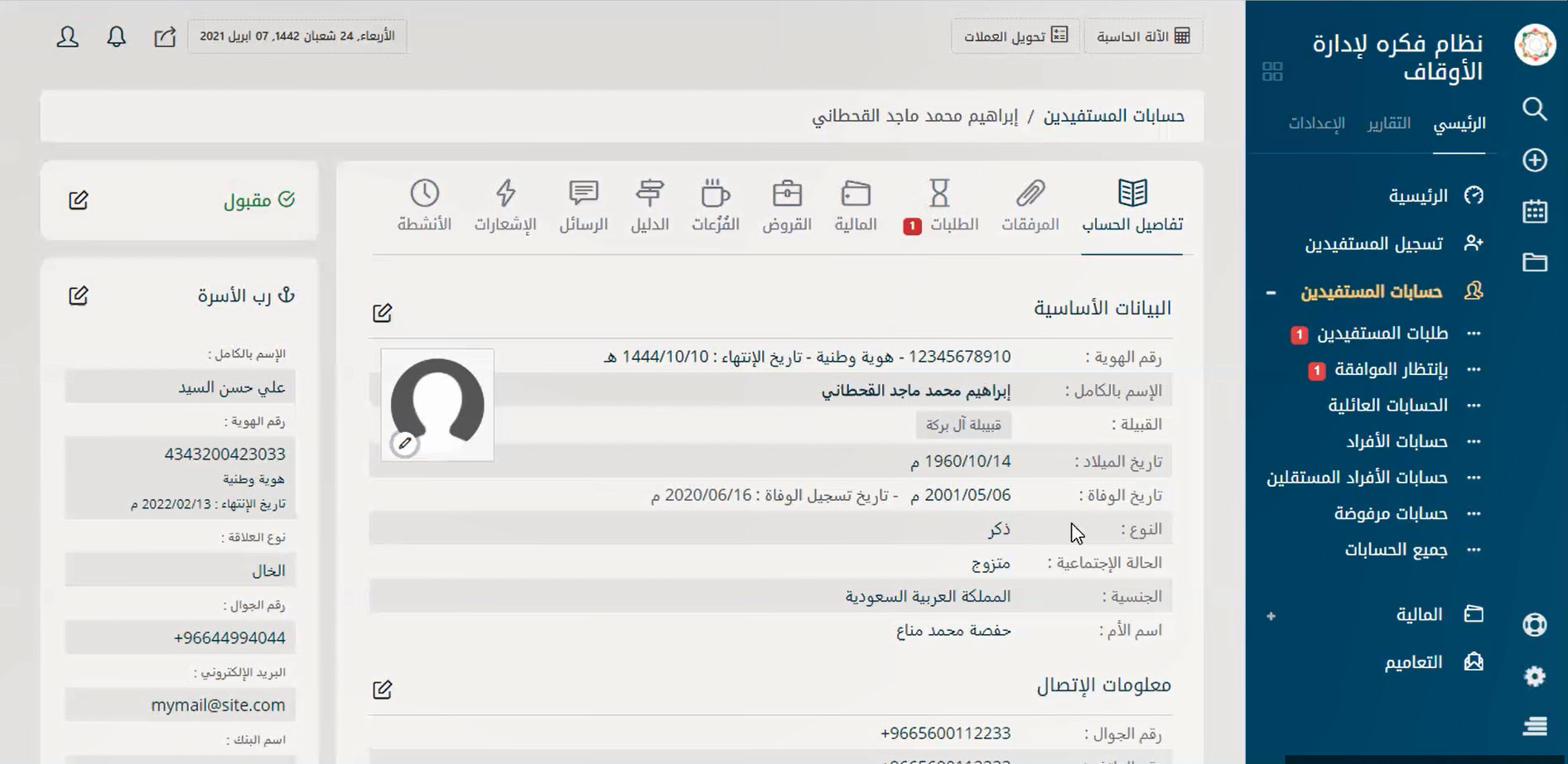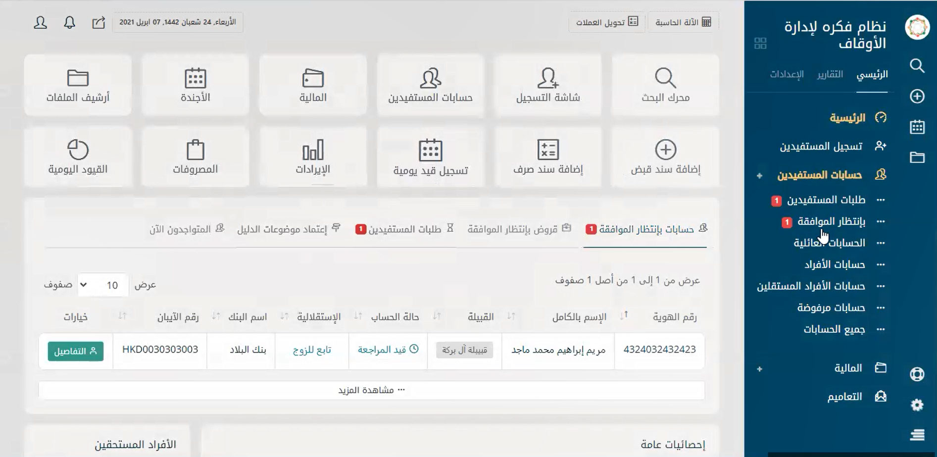 نظام إدارة متكامل لإدارة حسابات الموقوف عليهم والمستفيدين من الوقف بسهولة لتحقيق التحكم في كافة الأمور المتعلقة بهم مثل البحث عنهم بأي بيانات تخصهم ودعم ميزة البحث بالتصفية سواء بالاسم أو النوع أو القبيلة أو الحالة الاجتماعية أو الجنسية أو الدولة أو حتى المدينة أو تاريخ القيد على البرنامج وأيضًا تسجيل الحسابات الجديدة والحذف والتعديل على الحسابات الموجودة ومتابعة طلبات المستفيدين المختلفة والرد عليها.