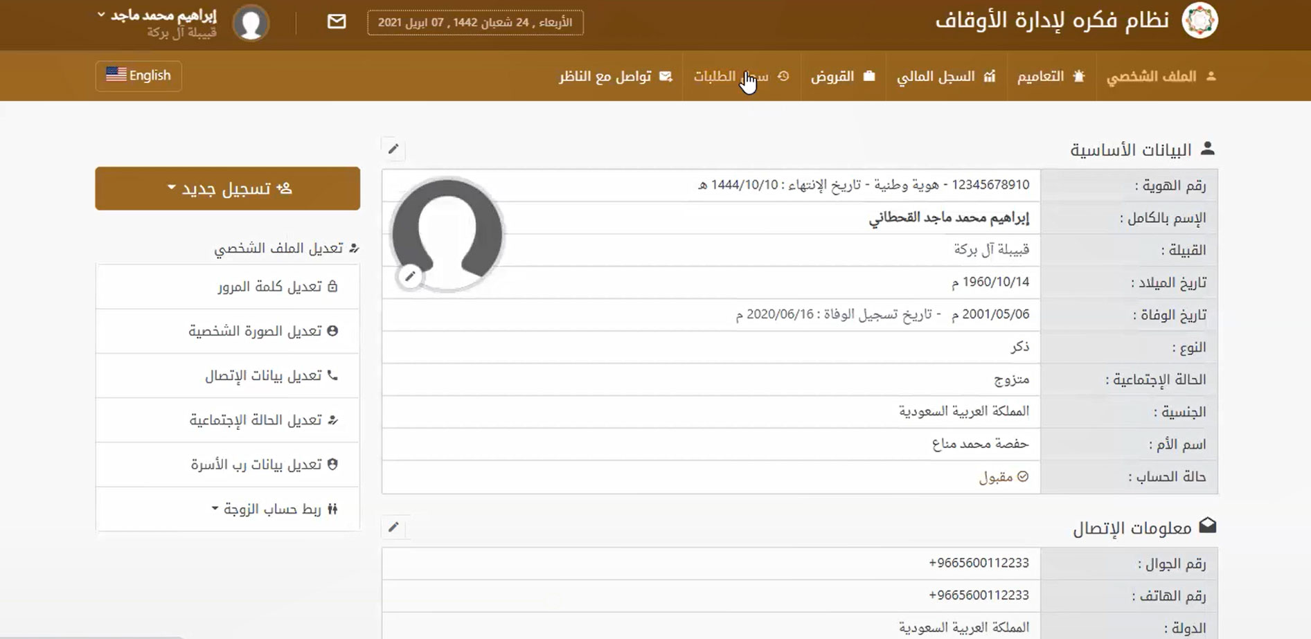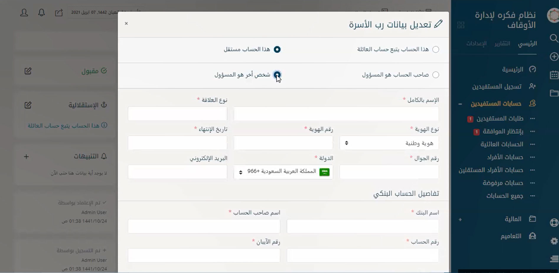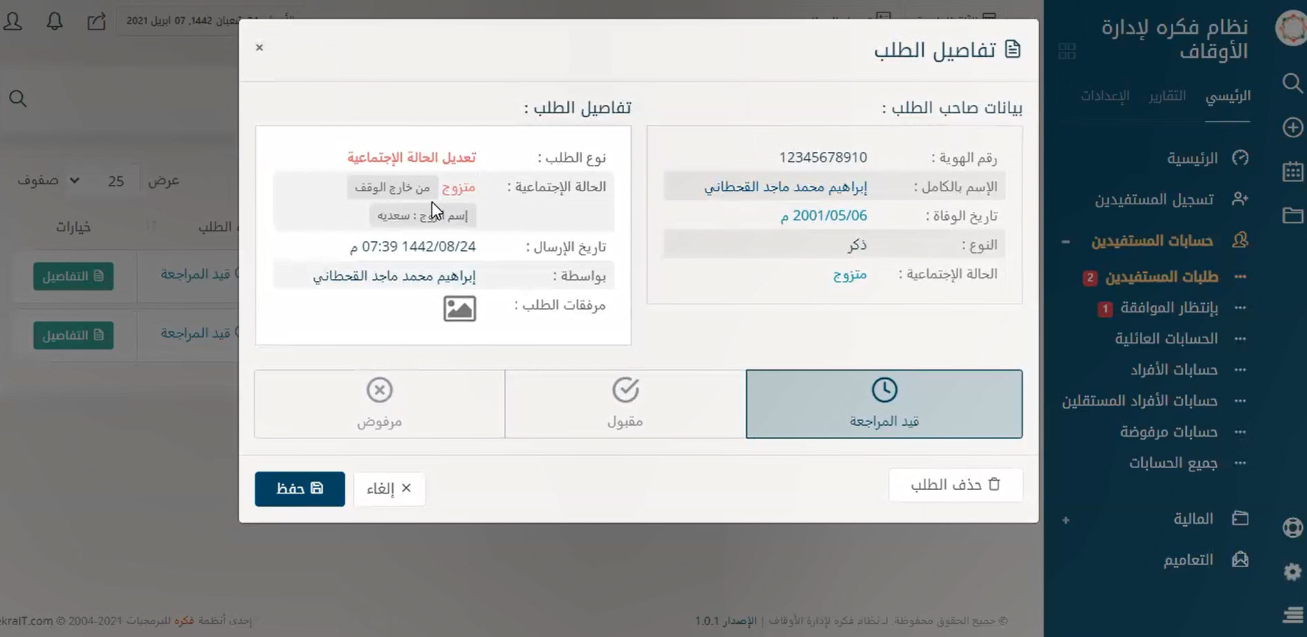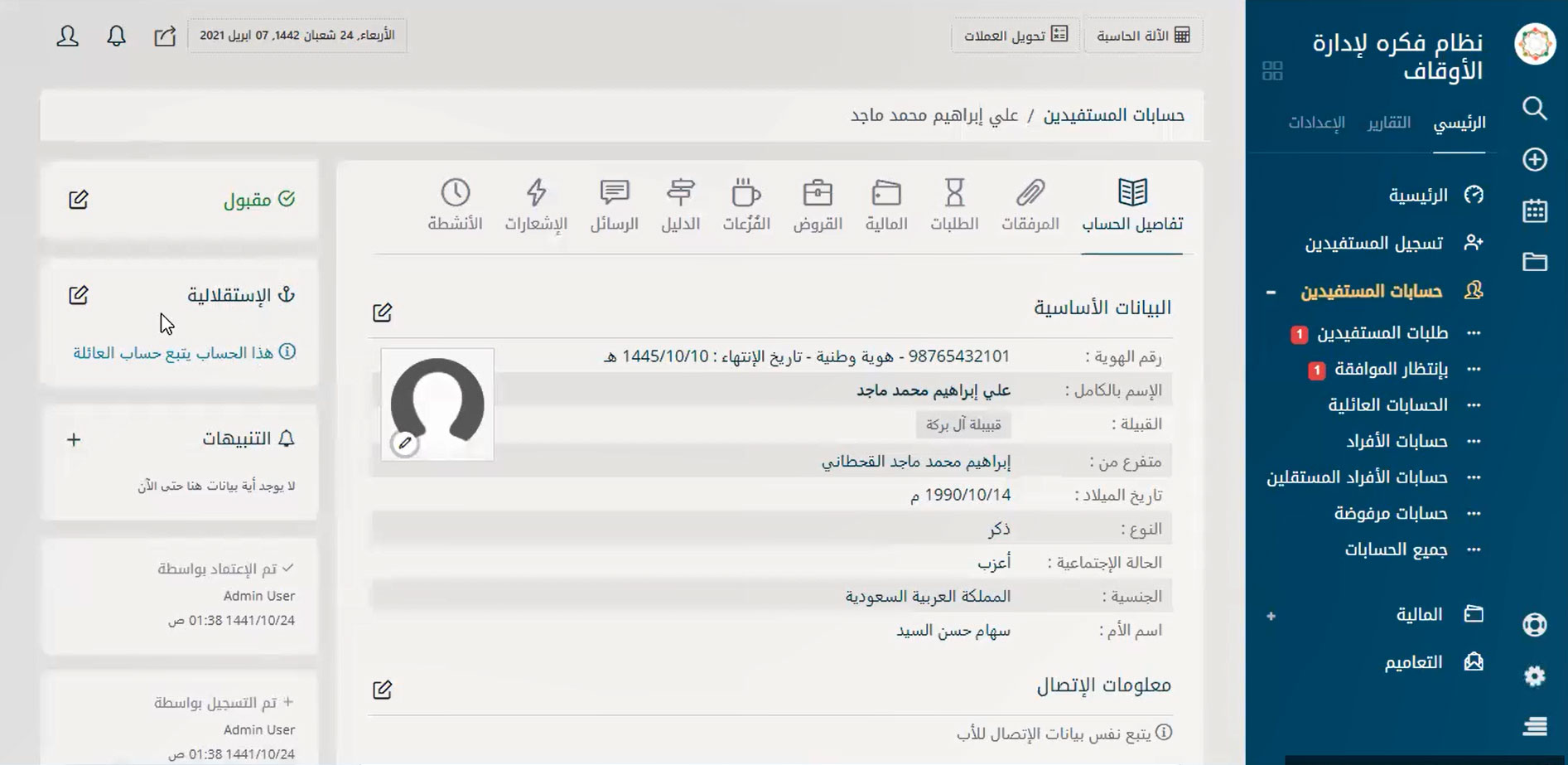 نظام إدارة متكامل لإدارة حسابات الموقوف عليهم والمستفيدين من الوقف بسهولة لتحقيق التحكم في كافة الأمور المتعلقة بهم مثل البحث عنهم بأي بيانات تخصهم ودعم ميزة البحث بالتصفية سواء بالاسم أو النوع أو القبيلة أو الحالة الاجتماعية أو الجنسية أو الدولة أو حتى المدينة أو تاريخ القيد على البرنامج وأيضًا تسجيل الحسابات الجديدة والحذف والتعديل على الحسابات الموجودة ومتابعة طلبات المستفيدين المختلفة والرد عليها.