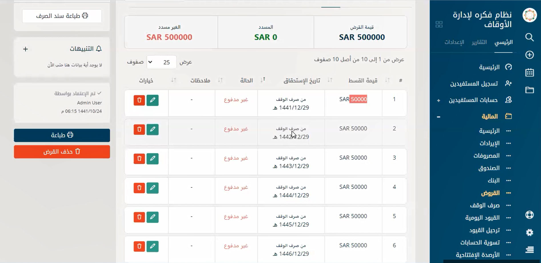 نظام محاسبة مالية متكامل يدعم شجرة الحسابات بجميع مستوياتها ويشمل الإيرادات والمصروفات والحسابات البنكية والصناديق المالية ويدعم نظام القروض للمستفيدين والقيود اليومية وترحيل القيود مع إمكانية إصدار جميع التقارير المالية مثل الحسابات الختامية والموازنات العامة والبيان المالي وتقارير الصناديق والبنوك وغيرها من التقارير الخاصة بالأمور المالية والحسابية المعنية بالوقف والمستفيدين.