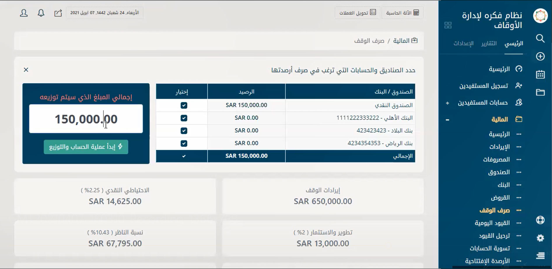 نظام إدارة ذكي لتوزيع غلة الوقف على المصارف المُحددة في شرط الواقف بدقة وأمان عالي عن طريق نظام مُميكن لصرف ريع الوقف على المستفيدين مع أتمتة الإجراءات وأخذ موافقات الصرف من الناظر بعد استقطاع المبالغ المستحقة للناظر والاحتياطي النقدي والتطوير والاستثمار وأعمال الصيانة وغيرها من الاستقطاعات وإجراء التحويلات المالية للمستفيدين إلى حساباتهم البنكية.