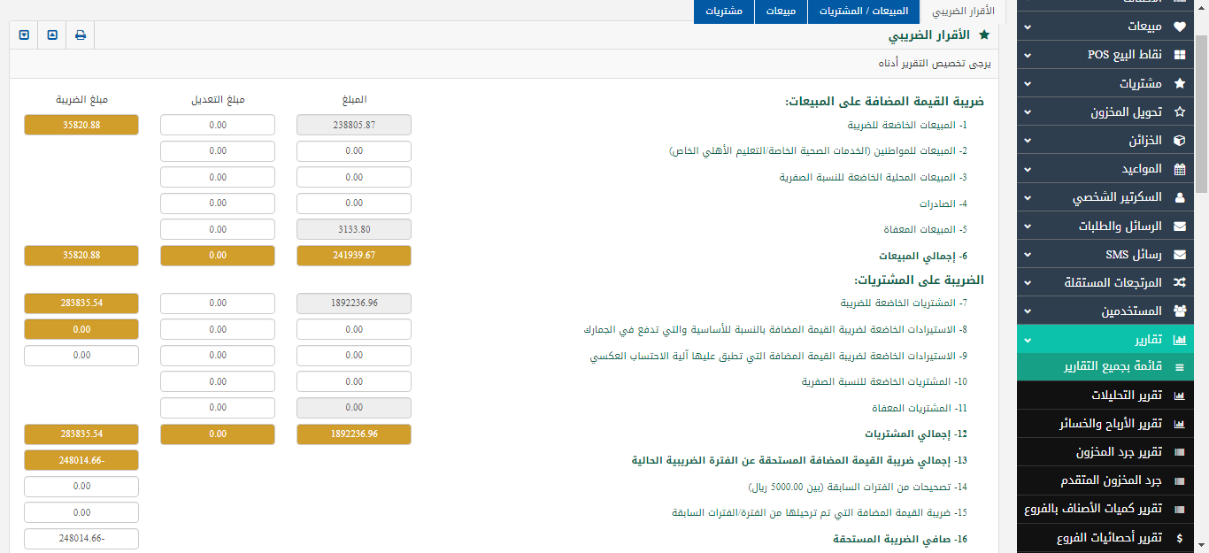 * تقارير مالية و ضريبية. * تقارير العملاء والموردين. * تقارير طواقم العمل. * تقارير المشتريات والمبيعات والضرائب.