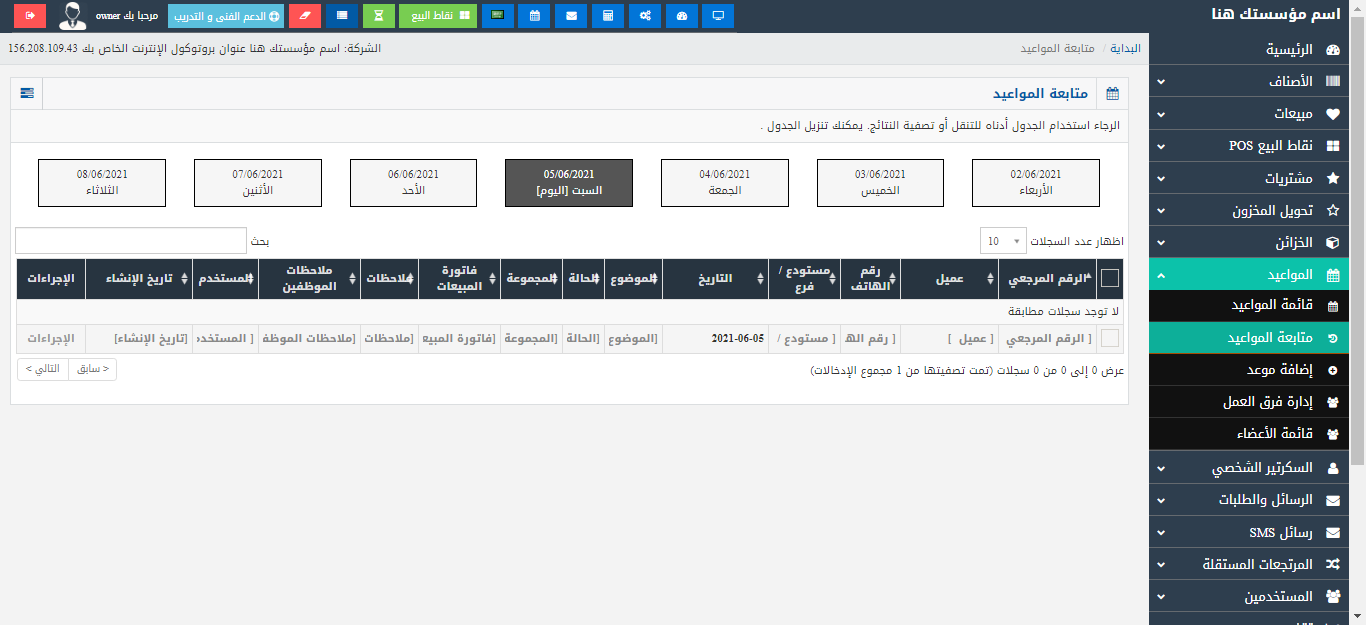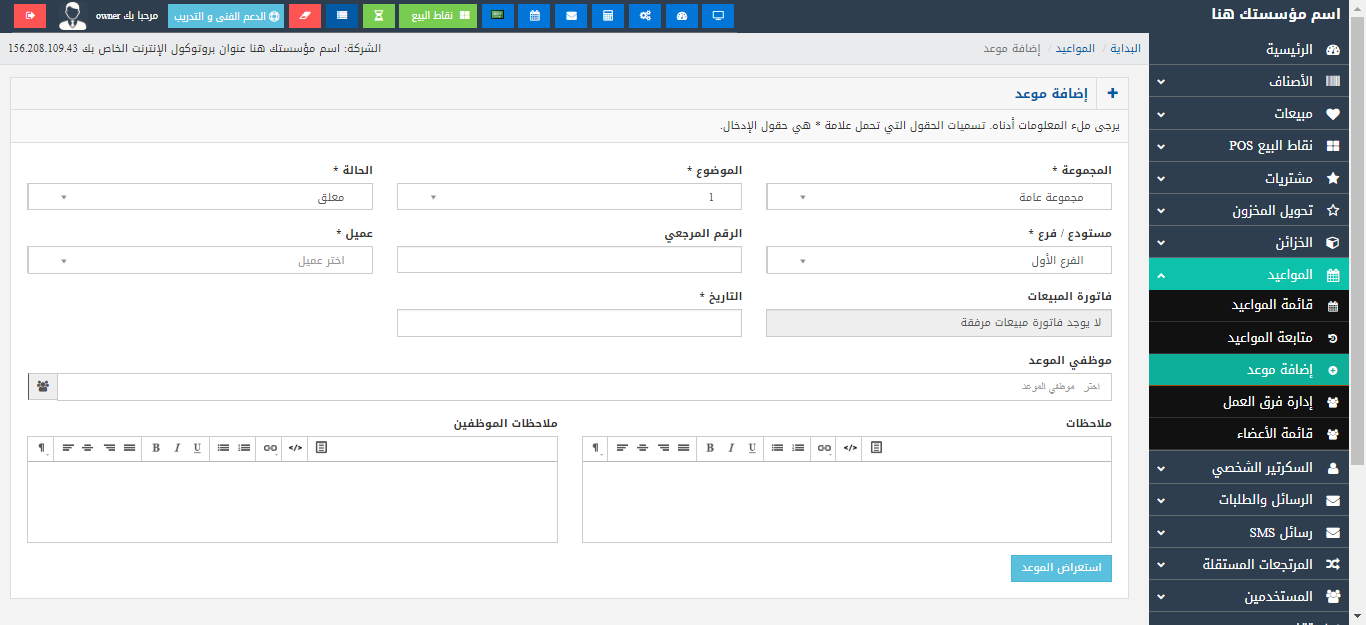 زيادة إنتاجية العمل وتقليل الوقت المُهدر في إتمام المهمام المختلفة عبر نظام إدارة مواعيد فريد يمنحك تحكم ومراقبة كاملة على إدارة مواعيد العملاء والموظفين وإدارة زيارات الفنيين ومواعيد الصيانة والتركيبات المختلفة ودعم التوقيع الإلكتروني للعميل.